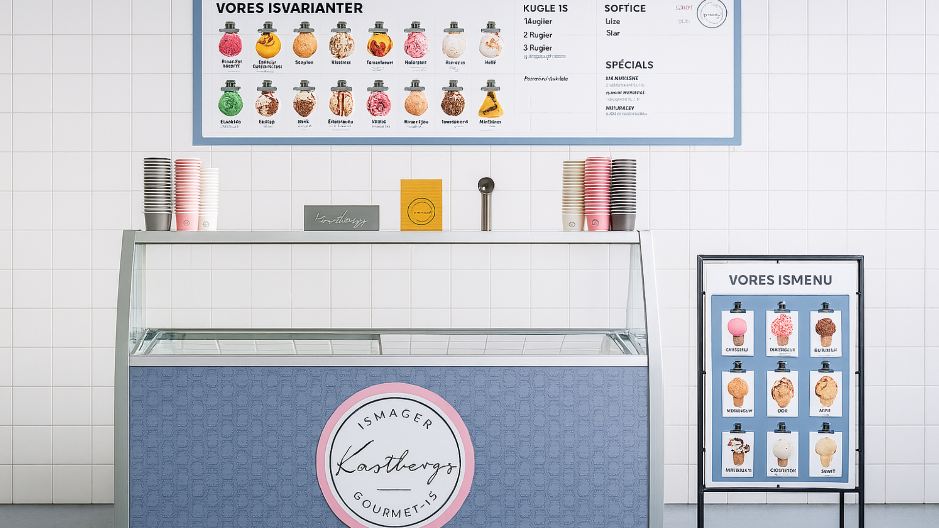 Har du behov for det, kan vi også hjælpe med det design og alt det grafiske såsom skilteløsninger, når du skal starte dit eget ishus.