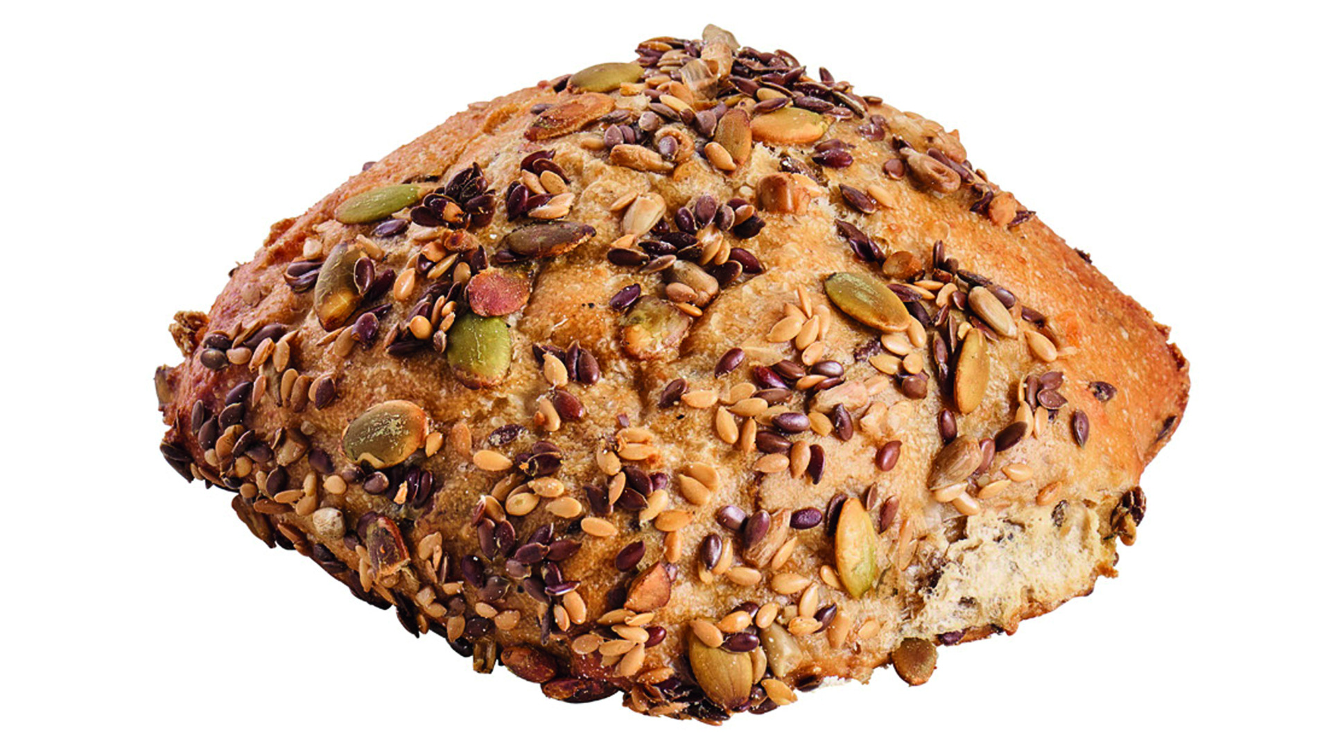 Rustik surdejsbolle med masser af græskarkerner, solsikkefrø og hørfrø – både indeni og ristede som topping. Bagt med hvedesurdej. Kold- og langtidshævet (18 timer).