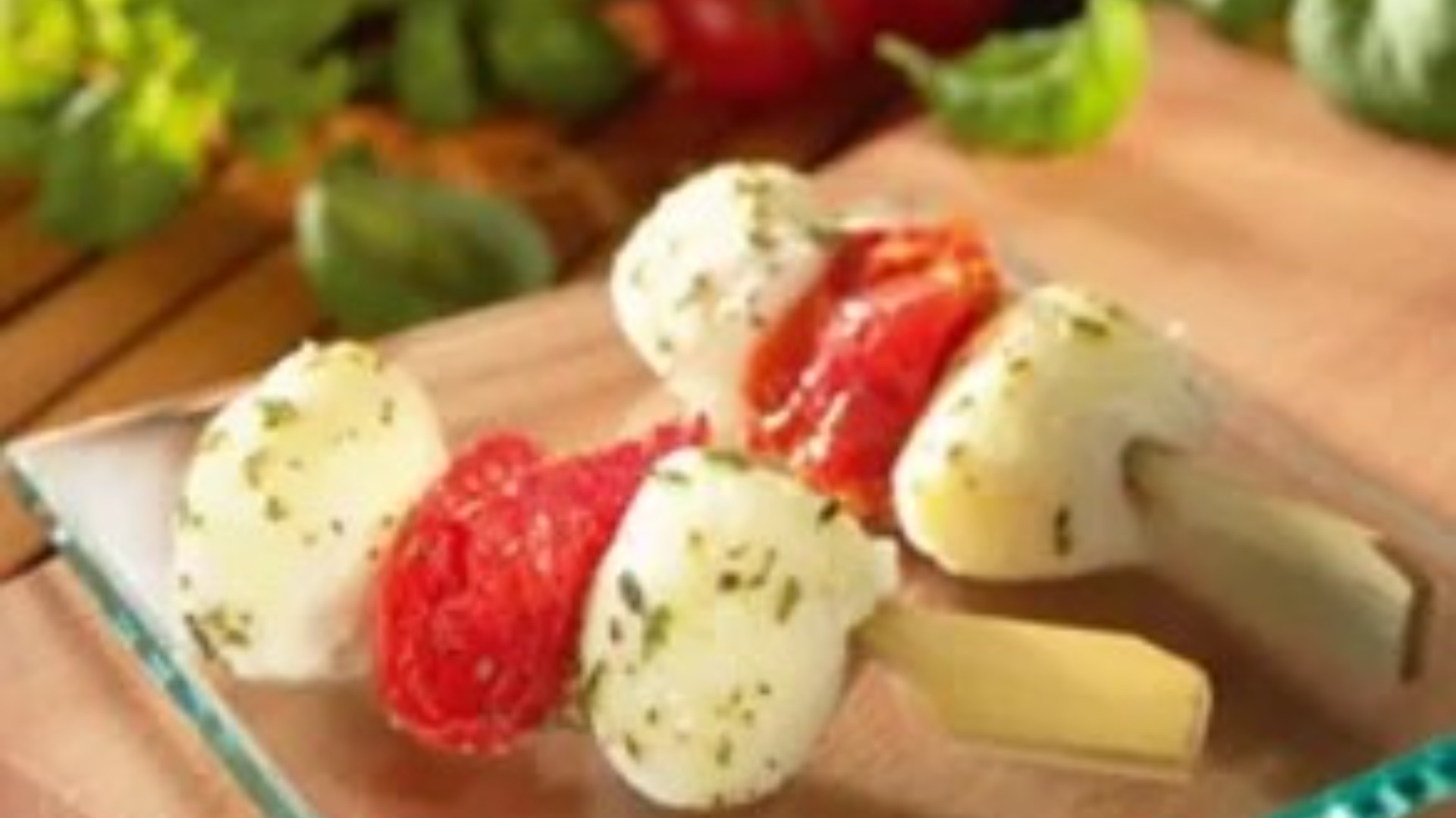 To mozzarella kugler marineret med pesto på et 9 cm spyd med en soltørret tomat imellem.